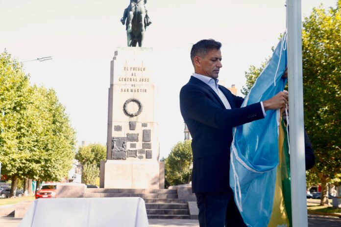 La ceremonia comenzó con el izamiento de la Bandera Nacional, encabezado por el intendente junto a autoridades e instituciones presentes. Posteriormente, el presidente del Honorable Concejo Deliberante, Franco Canepare, junto a concejales, izó la Bandera Bonaerense.