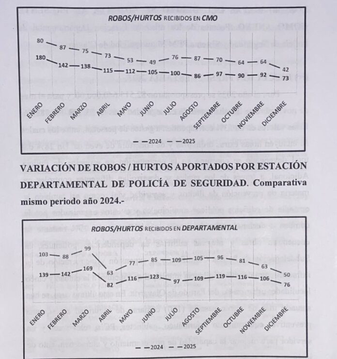 En tanto, informaron: “Según el Municipio, los robos registrados por el Centro de Monitoreo durante 2025 habrían descendido un 38,71%, mientras que los datos aportados por la Estación Departamental indican una baja del 25,25%. El propio informe señala textualmente que ´en ambos casos, la tendencia de inseguridad demuestra un significativo descenso respecto del mismo período del año anterior (2024)´”.