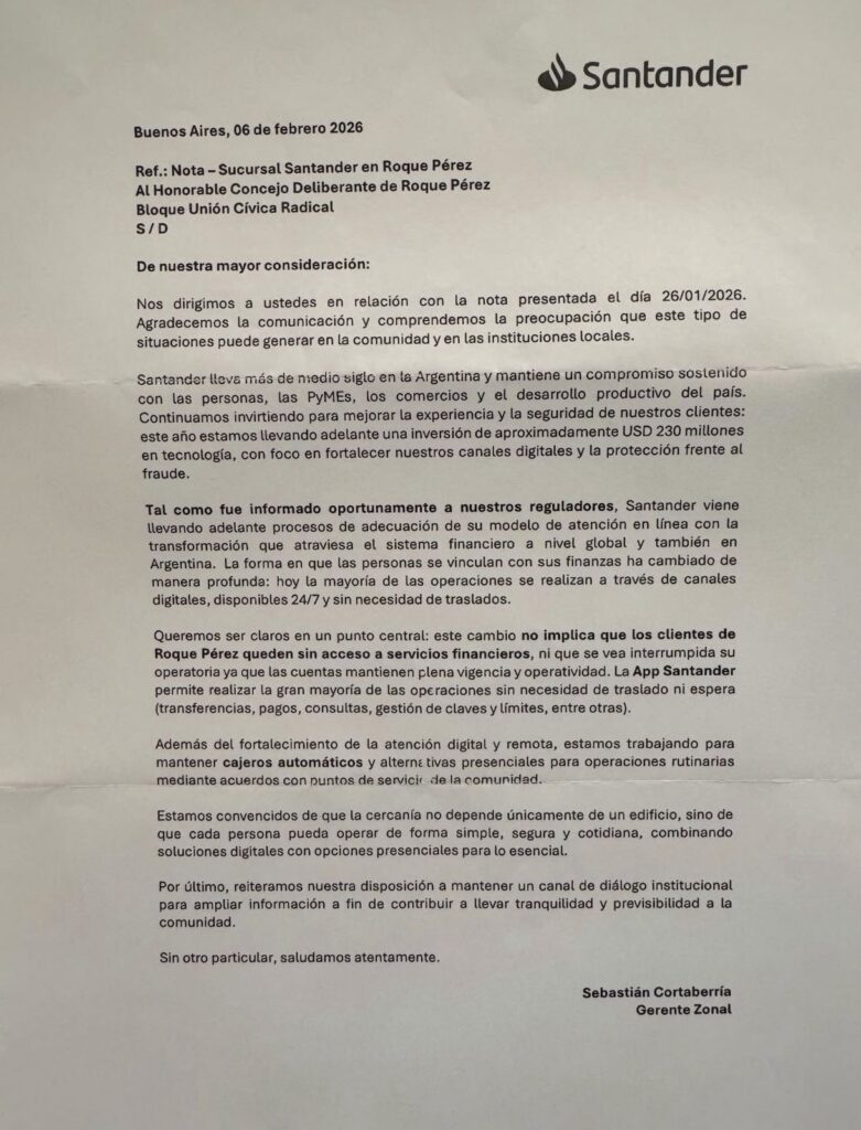 Y enfatiza la misiva: “Queremos ser claros en un punto central: este cambio no implica que los clientes de Roque Pérez queden sin acceso a servicios financieros, ni que se vea interrumpida su operatoria ya que las cuentas mantienen plena vigencia y operatividad. La App Santander permite realizar la gran mayoría de las operaciones sin necesidad de traslado ni espera (transferencias, pagos, consultas, gestión de claves y límites, entre otras)”.