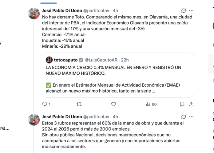 En una cataratas de tuits, señaló: “No hay derrame Toto. Comparando el mismo mes, en Olavarría, una ciudad del interior de PBA, el Indicador Económico Olavarría presentó una caída interanual del 17% y una variación mensual del –3%: Comercio: -21% anual Industria: -15% anual Minería: -29% anual”.