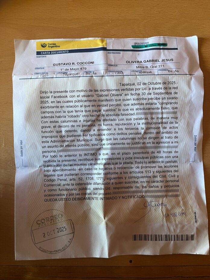 Tras esto, el intendente de Fuerza Patria, Gustavo Cocconi, decidió responderle a través de una carta documento a la que accedió Séptima Sección: “Dirijo la presente con motivo de las expresiones vertidas por Ud. a través de la red social Facebook con el usuario ´Gabriel Olivera´en fecha 30 de Septiembre de 2025, en las cuales públicamente manifestó que quien suscribe percibe un salario exorbitante en relación al que en verdad percibo, que además estaría ´comprando campos con la que tenía que pagar sueldos´ lo que es absolutamente falso, que además habría ´probado´otro hecho de absoluta falsedad”.