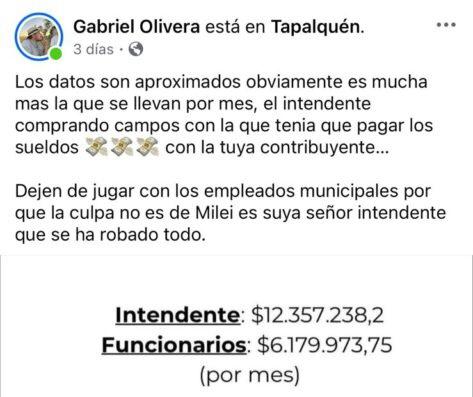 En primera instancia, Olivera publicó en su cuenta de Facebook una imagen que señala: “Intendente: $12.357.283,2 y funcionarios $6.179.973,75 por mes”.