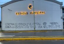 El jefe comunal 25 de Mayo, Ramiro Egüen, se refirió a las pintadas que se vieron este viernes en horas de la mañana en el paredón del Estadio Municipal del distrito. “Contra el Estado y el Capital. Hacia la liberación total Viva Wallmapu Libre. Santiago Presente”. “Quiero expresar mi más enérgico repudio a los actos … Sigue leyendo Vandalizaron el Estadio Municipal de 25 de Mayo y el intendente apuntó contra “fanáticos K”
