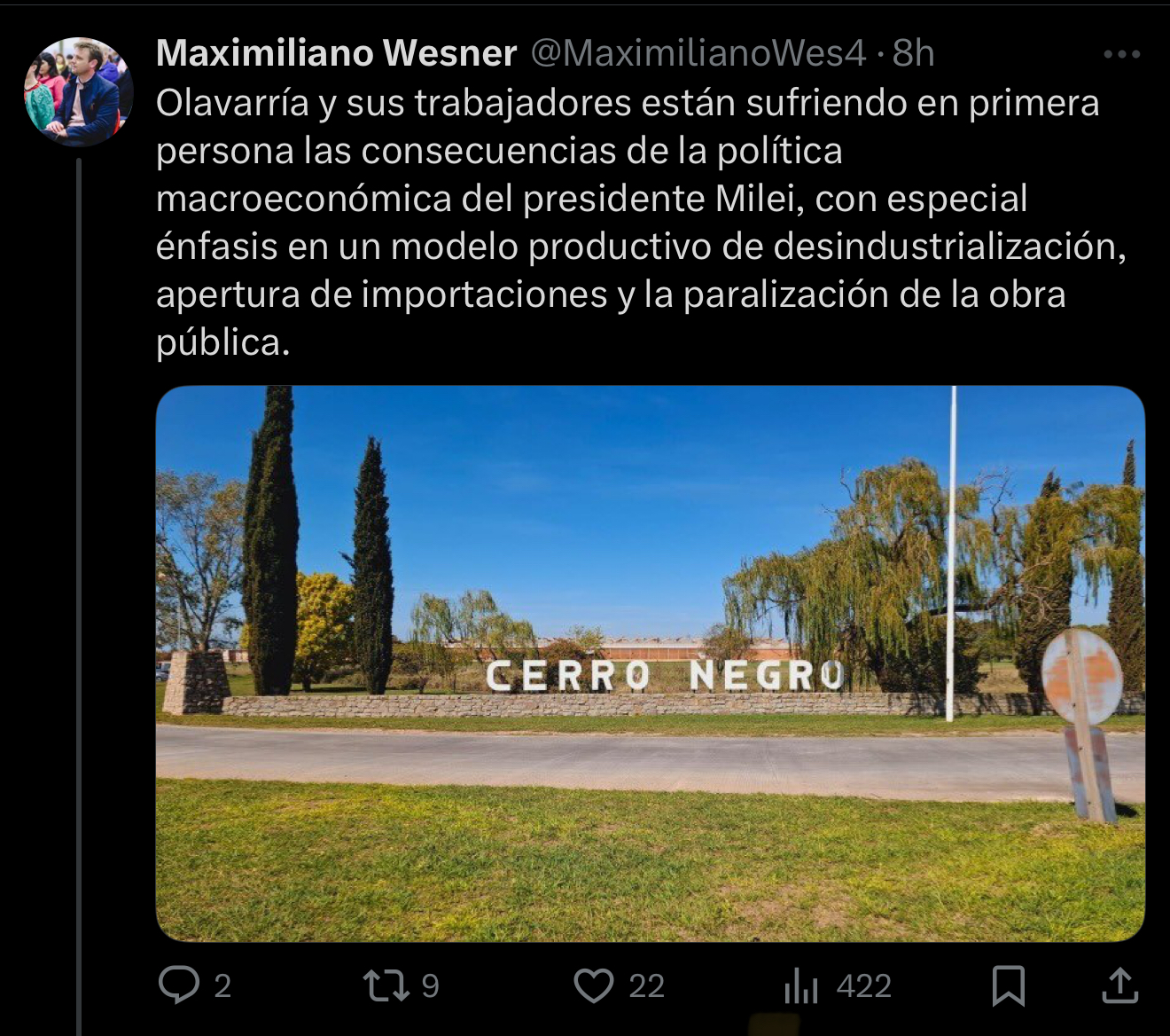 “Olavarría y sus trabajadores están sufriendo en primera persona las consecuencias de la política macroeconómica del presidente Milei, con especial énfasis en un modelo productivo de desindustrialización, apertura de importaciones y la paralización de la obra pública”, indicó a través de su cuenta de X en la que publicó varios mensajes refiriendose a la problemática.